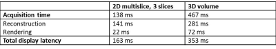 three 2D slices is acquired in 138ms/frame and displayed with a latency of 163ms. Discussion